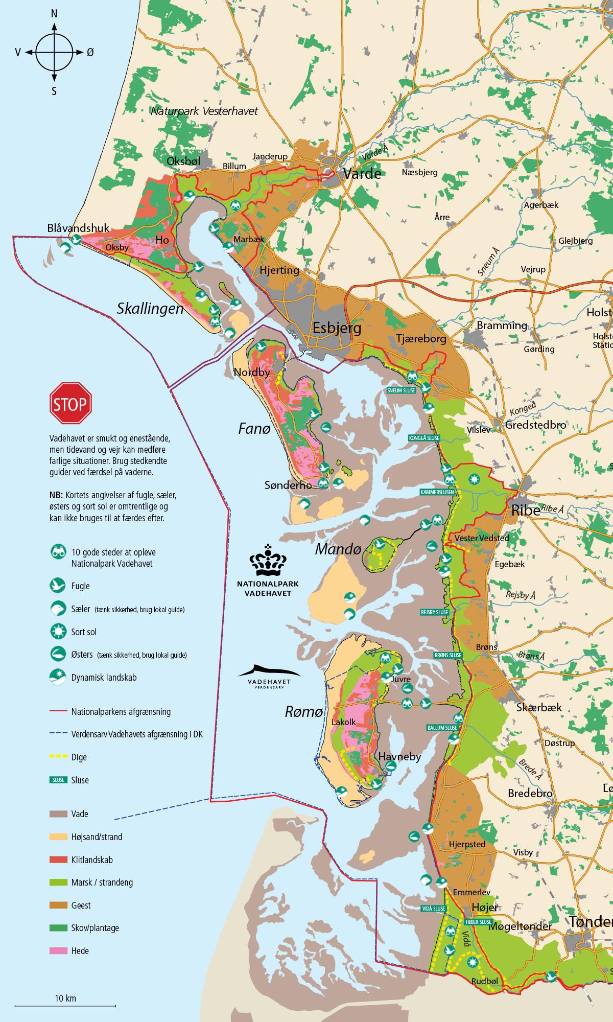 Oversigtskort over Vadehavet med angivelse af naturtyper, vadeflader og afgrænsninger af nationalpark og verdensarv